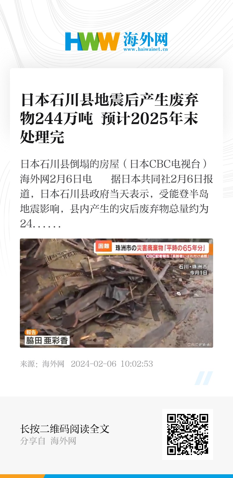 海外网2月6日电 据日本共同社2月6日报道,日本石川县政府当天表示,受能登半岛地震影响,县内产生的灾后废弃物总量约为244万吨以上。县政府称,争取在2025年末完成处理工作,还将通过海上运输等途径,在县外地区进行处理。