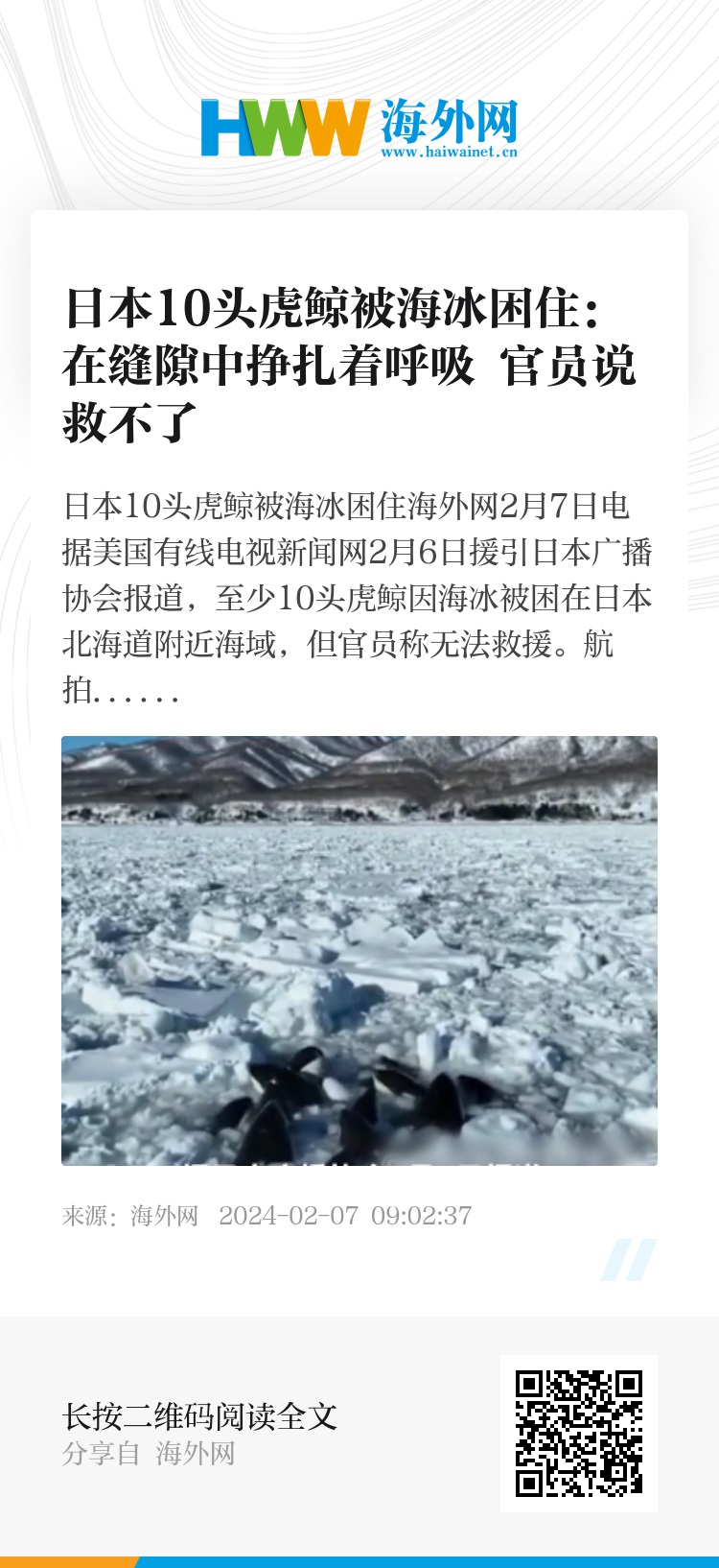 由于近海区域被浮冰覆盖,无法乘船靠近营救虎鲸,当地官员表示,他们唯一能做的就是等待,看看冰层是否会破裂,虎鲸是否会逃脱。