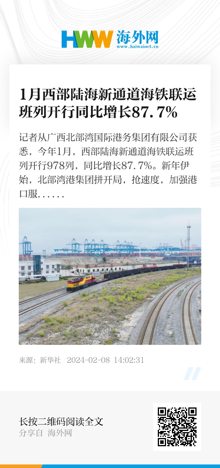 记者从广西北部湾国际港务集团有限公司获悉,今年1月,西部陆海新通道海铁联运班列开行978列,同比增长87.7%。
