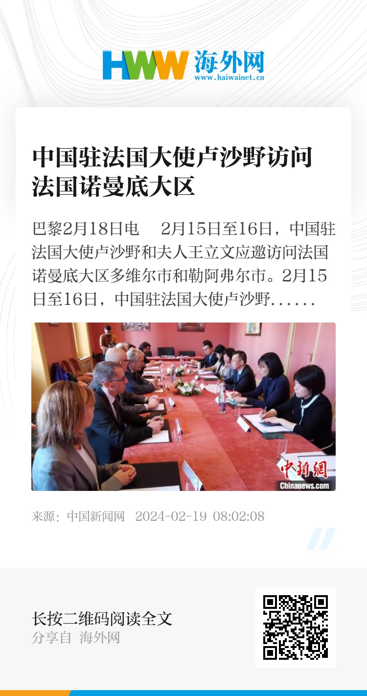 中新网巴黎2月18日电 2月15日至16日,中国驻法国大使卢沙野和夫人王立文应邀访问法国诺曼底大区多维尔市和勒阿弗尔市。