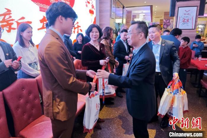 2月15日至16日,中国驻法国大使卢沙野和夫人王立文应邀访问法国诺曼底大区多维尔市和勒阿弗尔市。图为卢沙野向华侨华人、中资企业和留学生代表发放春节“暖心包”。中国驻法国大使馆供图