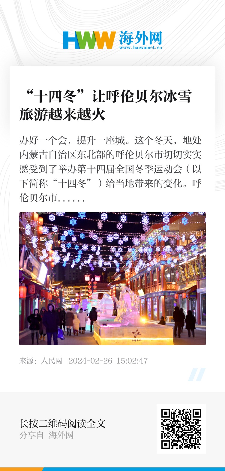 呼伦贝尔市副市长孙微介绍称,以承办“十四冬”为契机,呼伦贝尔把冰雪旅游作为四季旅游发展的重点,在做精做优夏秋旅游的基础上,做活做火冬春旅游,延长冰雪经济产业链,推进冰雪旅游产业向高端化、差异化、品牌化、特色化发展,全市冰雪旅游迎来全面发展的大好势头。