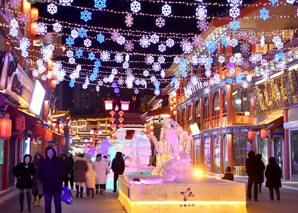 为了庆祝“十四冬”的举办,“巡游古城”沉浸式文化演艺活动正在古城上演,充满民族风情的表演让游客们连连称赞。在夜晚灯光的映衬下,古城街道上体现滑冰、滑雪、冰壶等冰雪运动元素的冰雕作品吸引众人驻足观看。