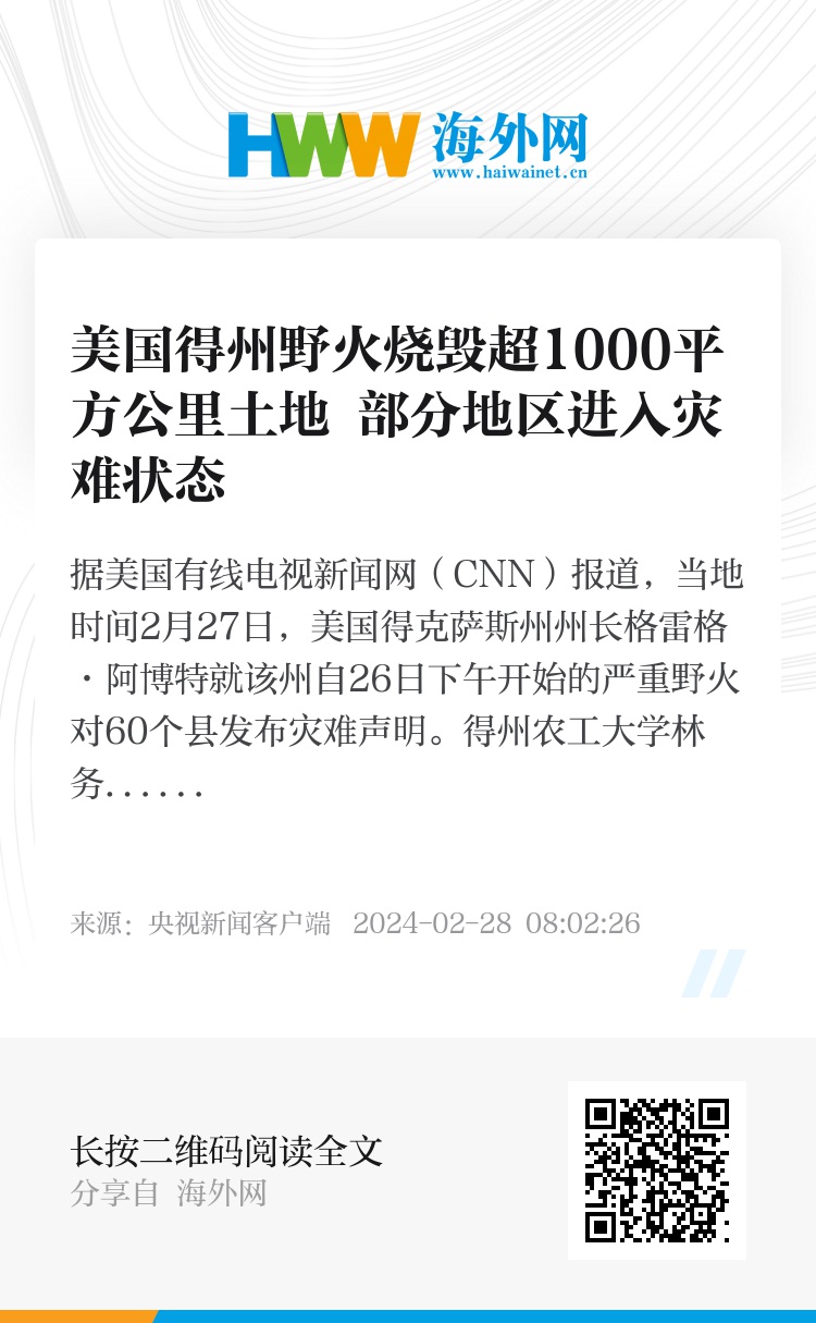 得州州长阿博特表示,该州预计未来几天将继续出现高温和大风天气,这会加大野火持续蔓延的风险,得州可能会有更多县进入灾难状态。(央视记者 许弢)