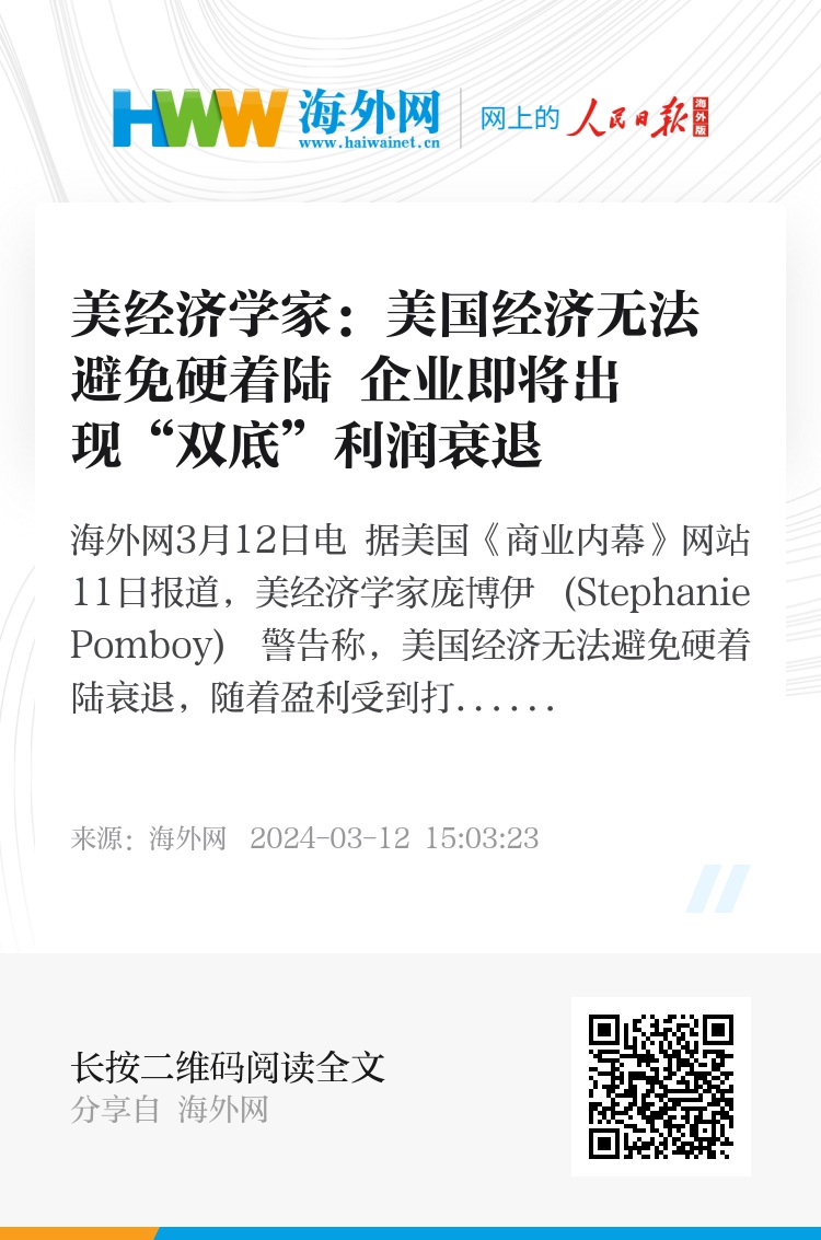 海外网3月12日电 据美国《商业内幕》网站11日报道,美经济学家庞博伊 (Stephanie Pomboy) 警告称,美国经济无法避免硬着陆衰退,随着盈利受到打击,美国企业随后将会出现“双底”利润衰退。