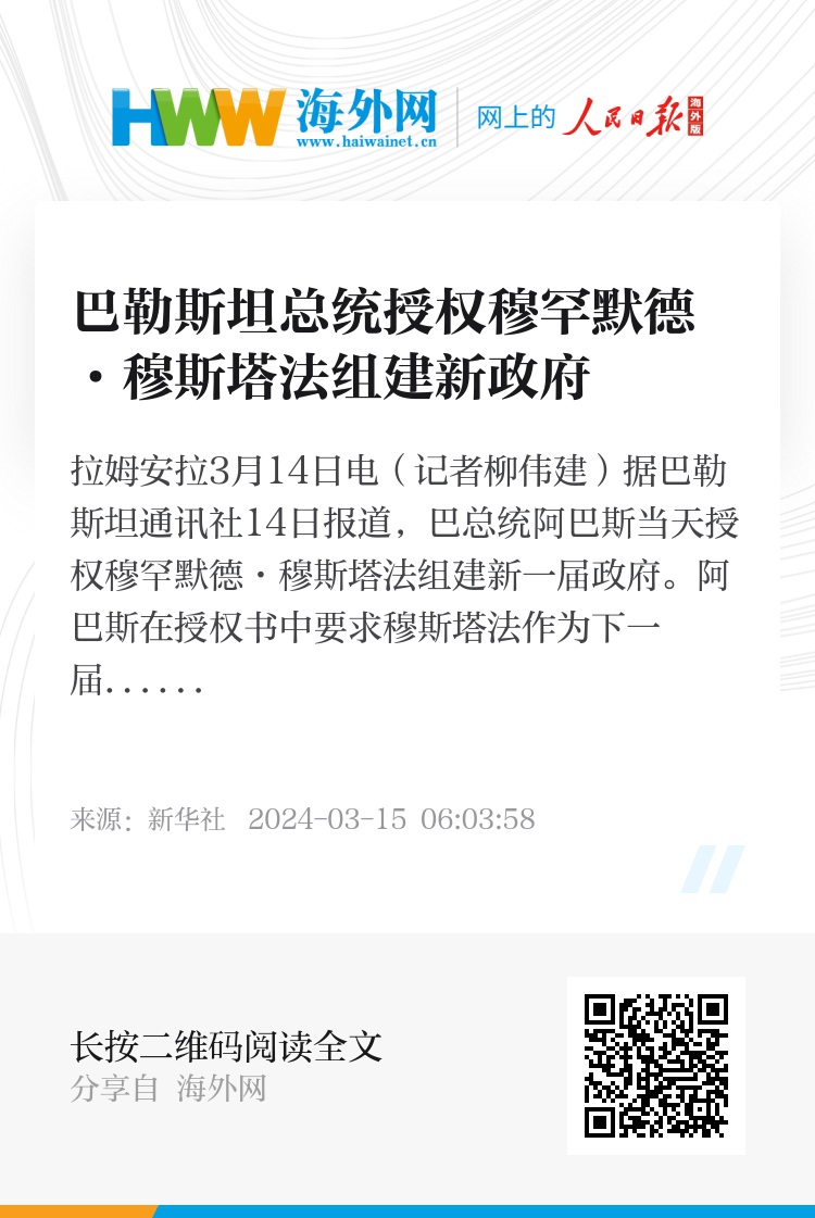 新华社拉姆安拉3月14日电(记者柳伟建)据巴勒斯坦通讯社14日报道,巴总统阿巴斯当天授权穆罕默德·穆斯塔法组建新一届政府。