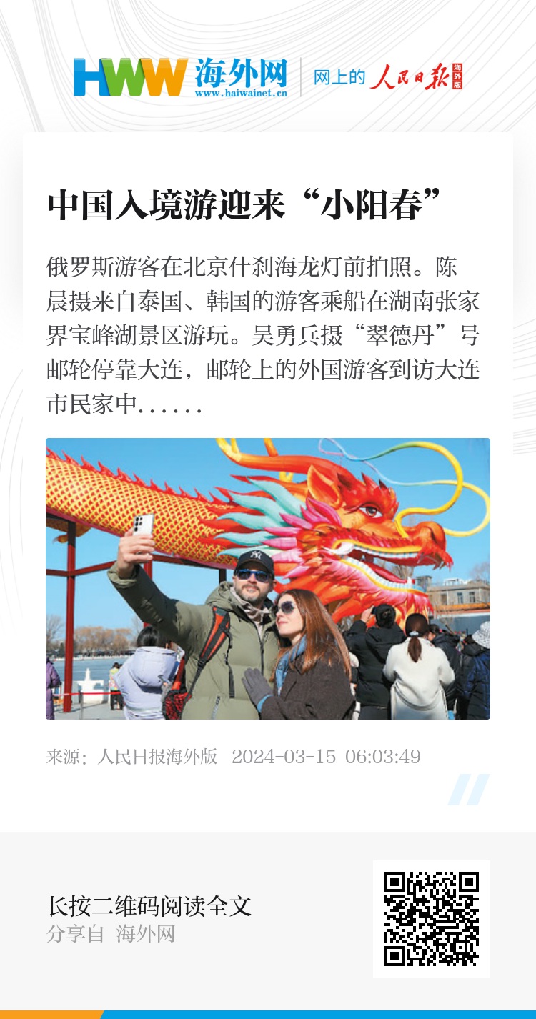 众信旅游集团首席政务官宁国新告诉记者:“自2023年底起,众信旅游每月都会迎来多个入境游团队。签证是外国游客入境中国的首个门槛,免签政策为外国游客敞开了旅游大门,对入境游发展将起到长效的助推作用。”