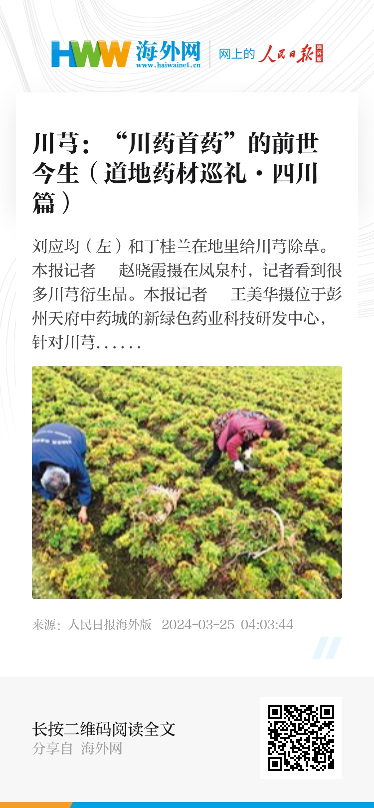 近来,一款来自中国四川的道地药材川芎(音同胸),在中药走出去过程中连获喜讯。