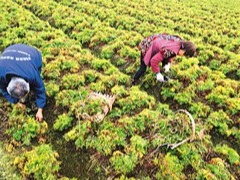 这是敖平镇凤泉村一片川芎种植地。身着蓝色长外套,脚蹬一双雨鞋的刘应均和爱人丁桂兰正用小铲子,在密密麻麻的川芎中,又快又准地挖出一株株杂草,将它们扔进不远处的竹篮中。今年68岁的他已经种了十几年川芎,靠着4亩地,一年收入能到五六万元。