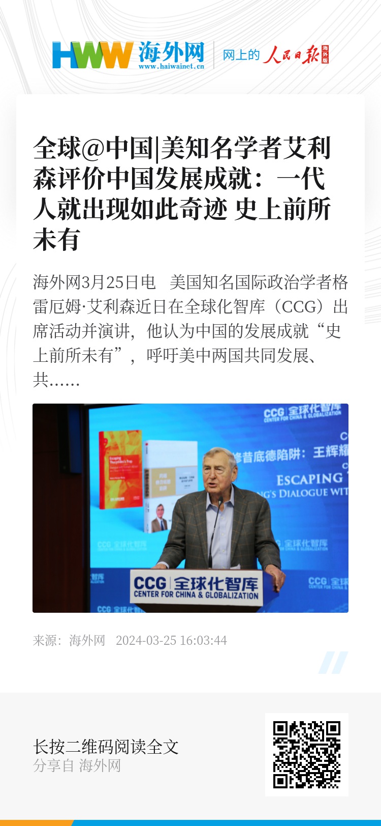 海外网3月25日电 美国知名国际政治学者格雷厄姆·艾利森近日在全球化智库(CCG)出席活动并演讲,他认为中国的发展成就“史上前所未有”,呼吁美中两国共同发展、共迎挑战。