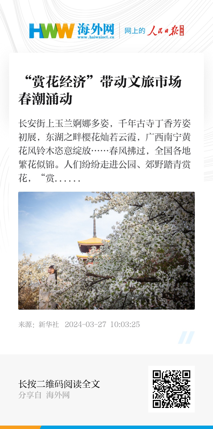 长安街上玉兰婀娜多姿,千年古寺丁香芳姿初展,东湖之畔樱花灿若云霞,广西南宁黄花风铃木恣意绽放……春风拂过,全国各地繁花似锦。人们纷纷走进公园、郊野踏青赏花,“赏花热”掀起春日旅游热潮,为城乡消费注入蓬勃动能。