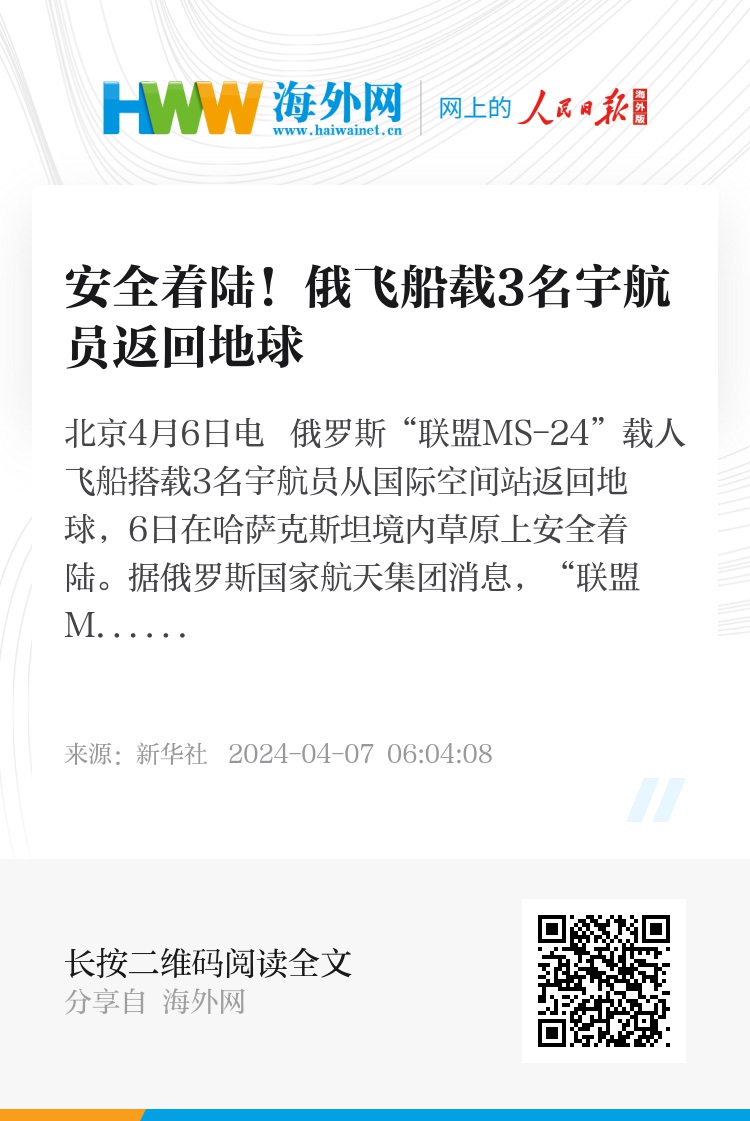 新华社北京4月6日电 俄罗斯“联盟MS-24”载人飞船搭载3名宇航员从国际空间站返回地球,6日在哈萨克斯坦境内草原上安全着陆。