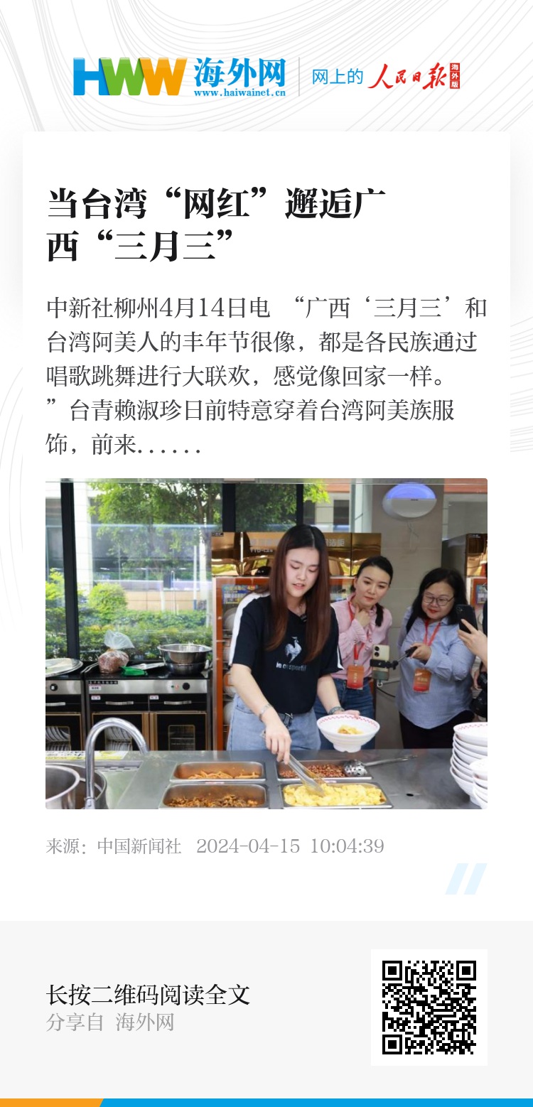 “在广西,唱山歌很有意思,我们家乡也有类似的山歌。”赖淑珍说。参加广西“三月三”后,她希望明年能够邀请更多台湾民众来广西,让两岸民众通过“三月三”进行更多交流。