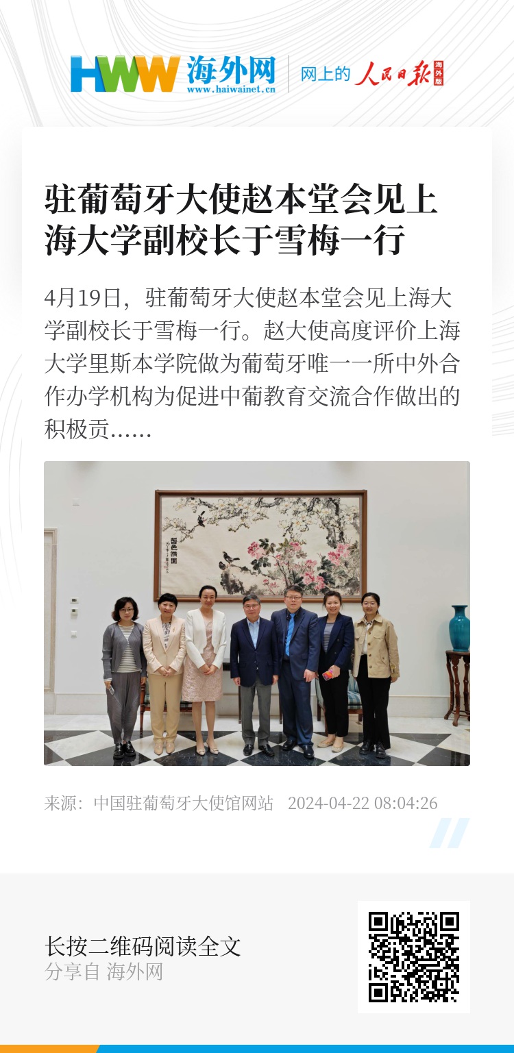 4月19日,驻葡萄牙大使赵本堂会见上海大学副校长于雪梅一行。
