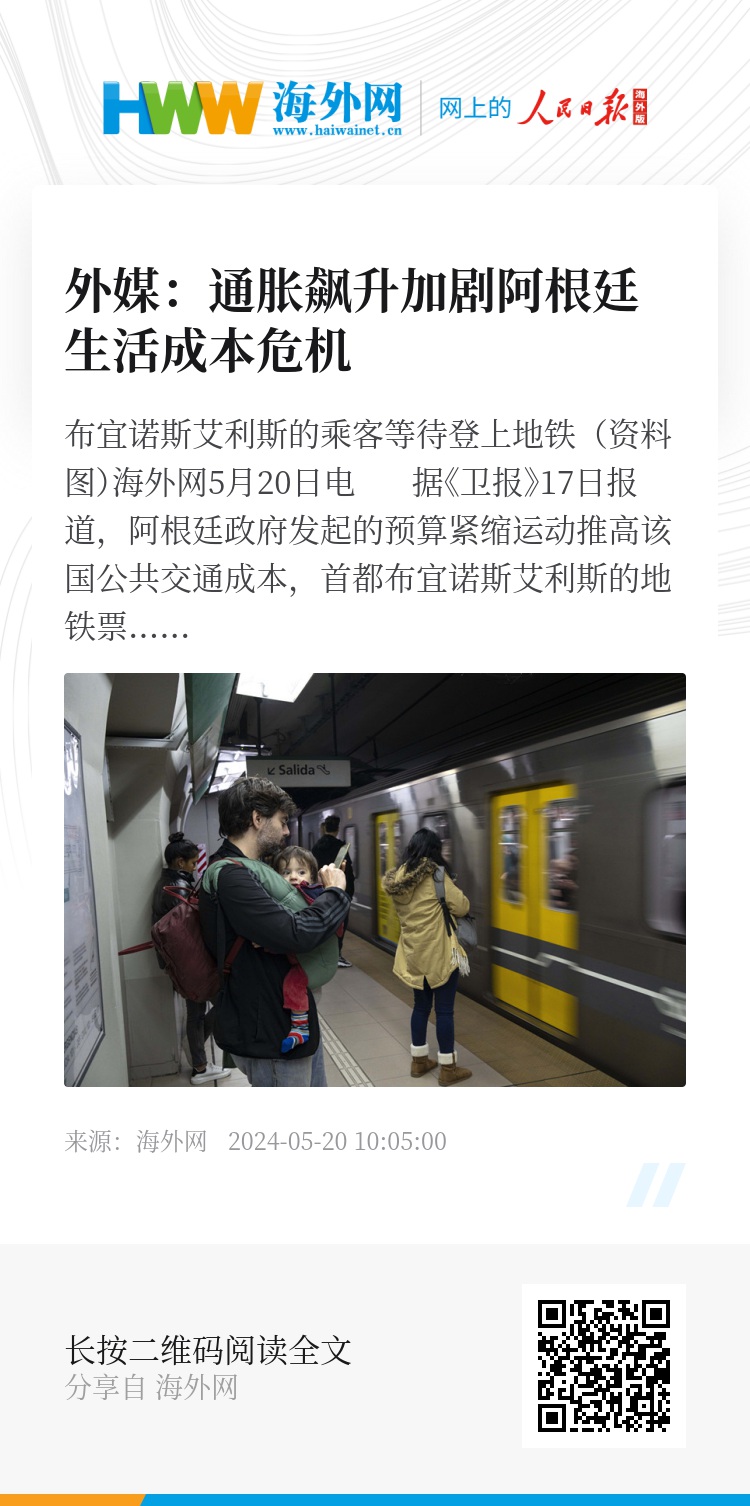 海外网5月20日电 据《卫报》17日报道,阿根廷政府发起的预算紧缩运动推高该国公共交通成本,首都布宜诺斯艾利斯的地铁票价5月16日到17日一夜之间上涨了360%。