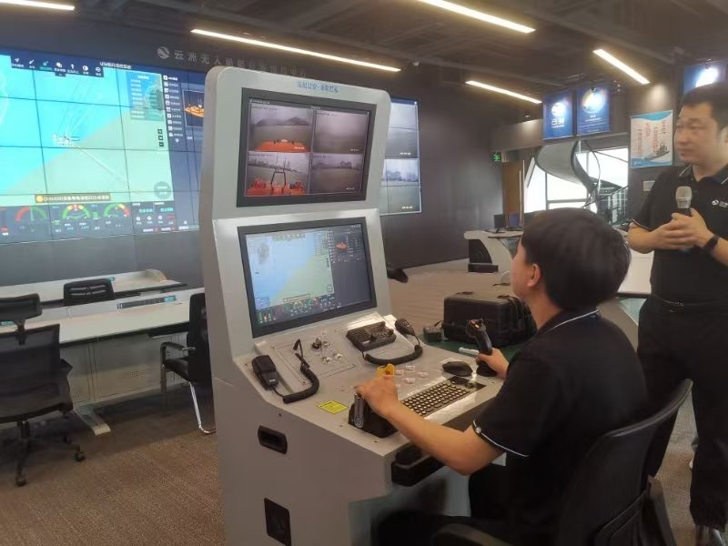 在云洲无人船艇岸基指控中心,工作人员正在开展无人船的水下探测任务执行演练。王云娜摄