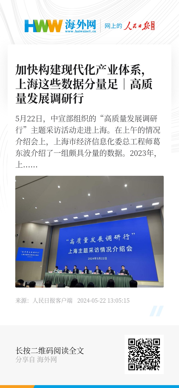5月22日,中宣部组织的“高质量发展调研行”主题采访活动走进上海。在上午的情况介绍会上,上海市经济信息化委总工程师葛东波介绍了一组颇具分量的数据。