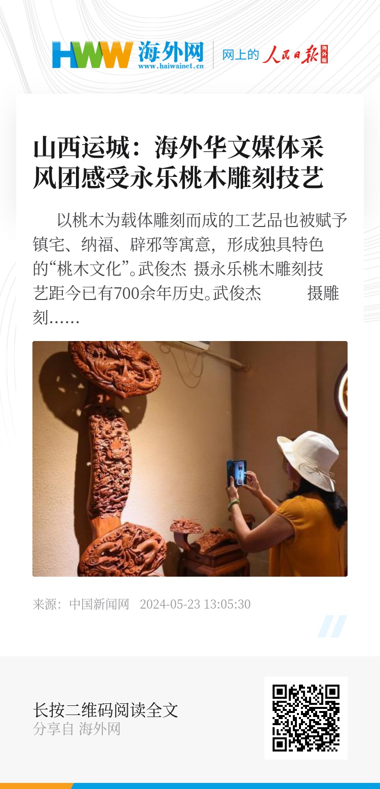 5月22日,“行走河东·沿着黄河看非遗”海外华文媒体采风行活动正在山西运城举办。来自美国、法国、加拿大、瑞典、意大利、葡萄牙等国家和地区的海外华文媒体代表走进芮城县理天木雕文化研究所,参观欣赏国家级非物质文化遗产项目“永乐桃木雕刻”。永乐桃木雕刻技艺距今已有700余年历史,随着该技艺不断发展成熟,出现雕、镂、镌、刻、镶、嵌、剔、轧等技法,并衍生出轮、螺、伞、盖、莲、罐、鱼、肠等桃木雕刻“八宝”。此次活动由中共运城市委宣传部指导,运城市归国华侨联合会主办,中新社国际传播集团山西分公司承办。