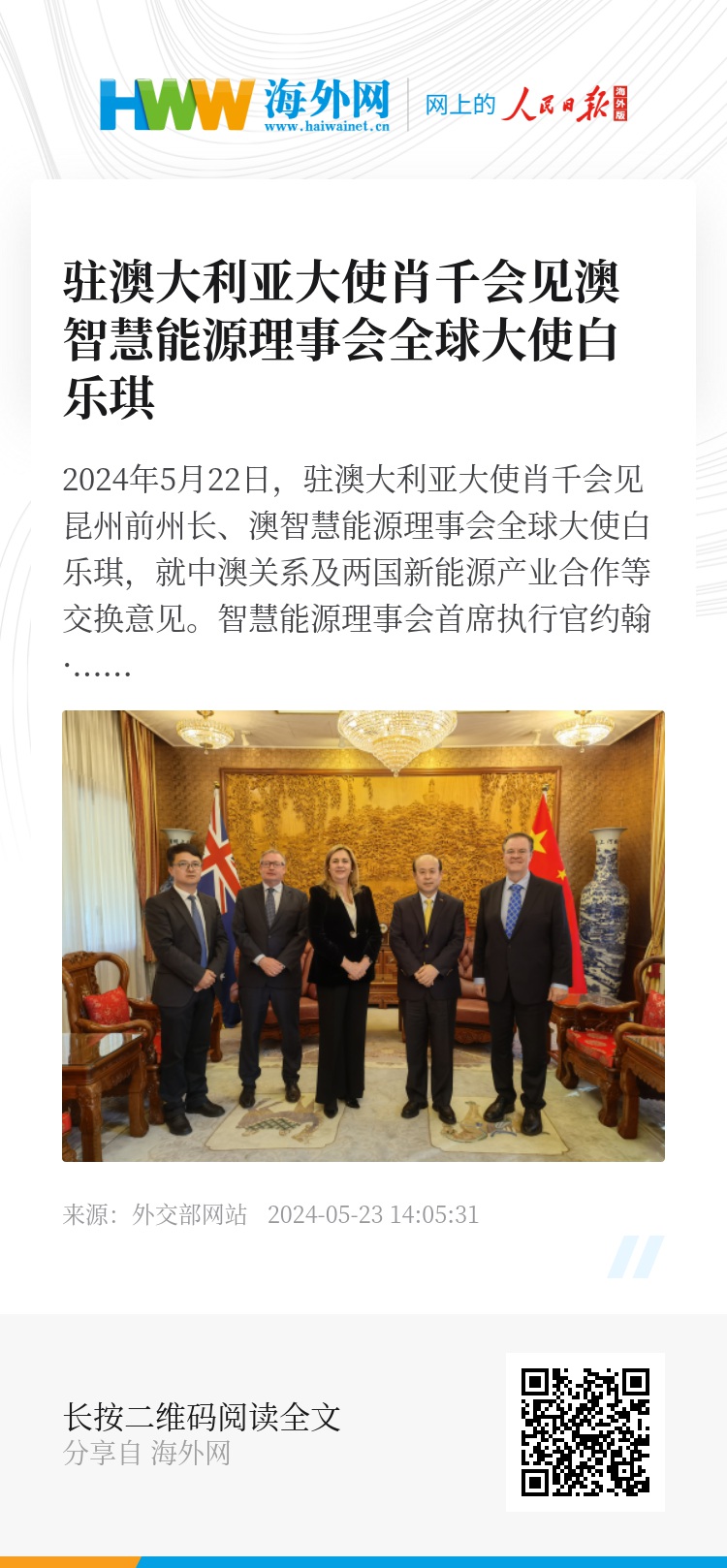 2024年5月22日,驻澳大利亚大使肖千会见昆州前州长、澳智慧能源理事会全球大使白乐琪,就中澳关系及两国新能源产业合作等交换意见。智慧能源理事会首席执行官约翰·格莱姆斯等参加会见。