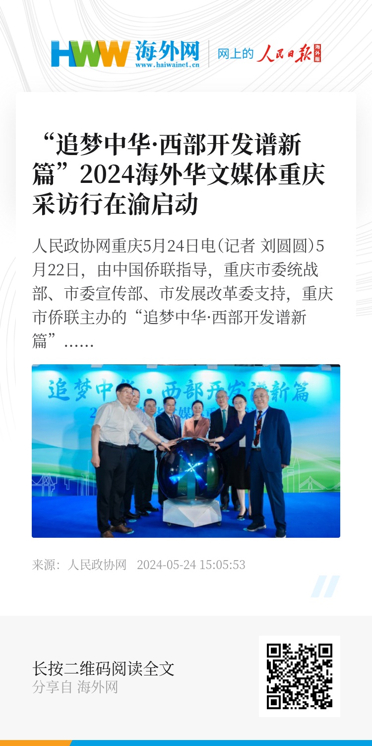 “追梦中华·西部开发谱新篇”2024海外华文媒体重庆采访行活动历时7天,来自德国、奥地利、美国、加拿大、墨西哥、韩国、日本、澳大利亚等15个国家和地区的18家海外华文媒体以及6家涉侨中央媒体代表参加此次活动。采访团一行将深入涪陵、渝中、沙坪坝、渝北、忠县、奉节等地,通过实地考察、参访交流等形式,传承“嘉庚精神”,见证改革发展成果,体会巴渝的开放开发、创新活力,感受重庆的改革之力、发展之势,生动描绘重庆落实习近平总书记殷殷嘱托所呈现的奋斗精神和非凡业绩,向世界展示中国式现代化重庆发展篇章。