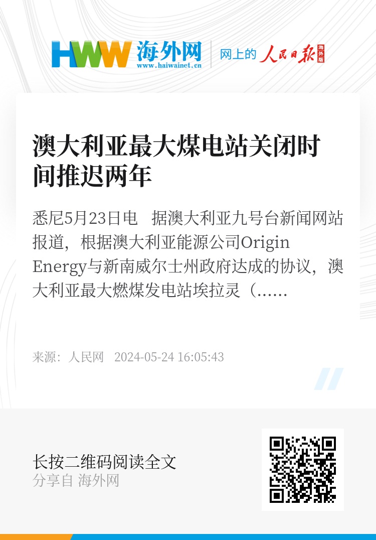 人民网悉尼5月23日电 据澳大利亚九号台新闻网站报道,根据澳大利亚能源公司Origin Energy与新南威尔士州政府达成的协议,澳大利亚最大燃煤发电站埃拉灵(Eraring)发电站的关闭时间将推迟两年。