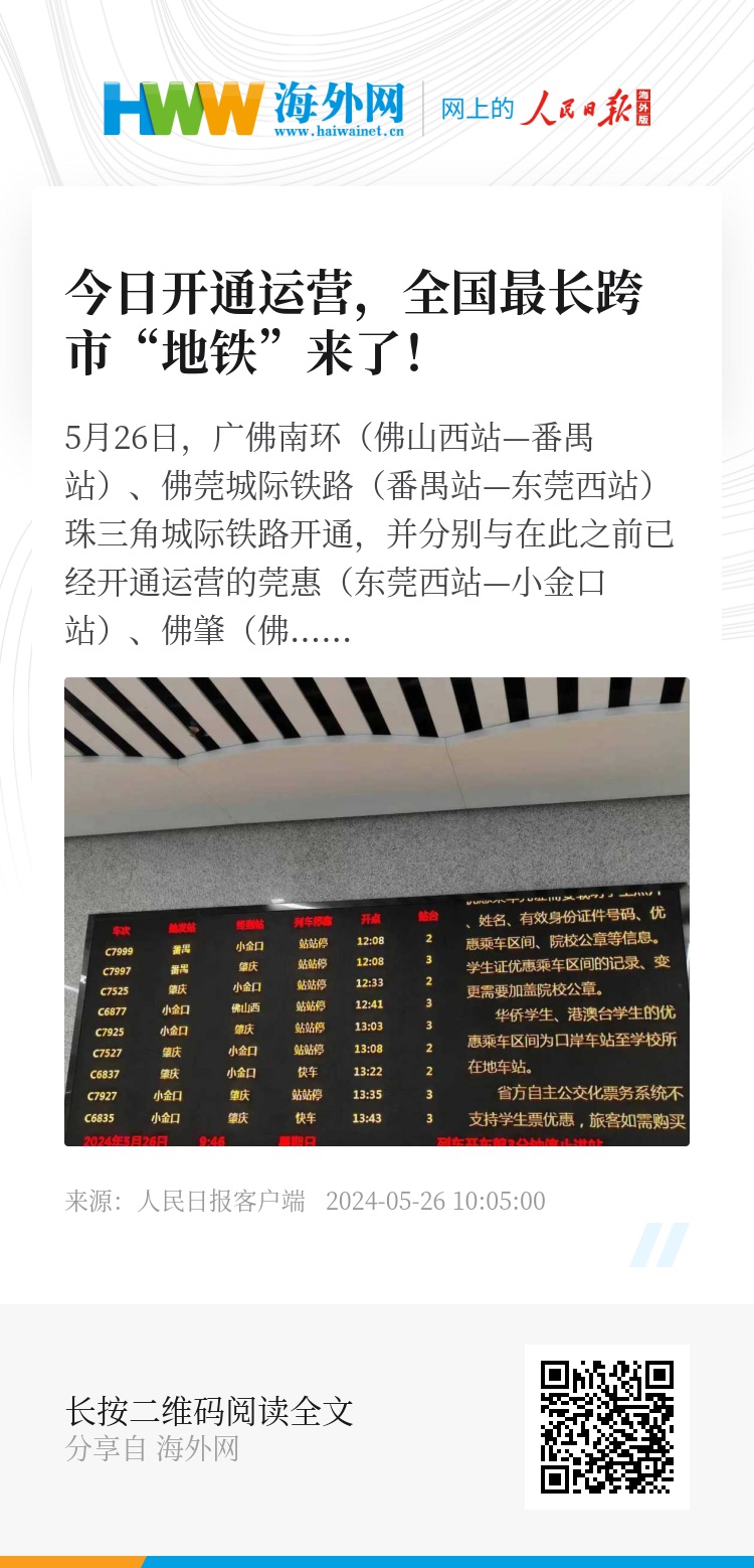 5月26日,广佛南环(佛山西站—番禺站)、佛莞城际铁路(番禺站—东莞西站)珠三角城际铁路开通,并分别与在此之前已经开通运营的莞惠(东莞西站—小金口站)、佛肇(佛山西站—肇庆站)接驳,标志着从肇庆到惠州的4条城际铁路实现“四线”贯通,形成了一条横跨广州、佛山、肇庆、东莞、惠州5座城市的东西走向交通大动脉,总里程258公里、总车站数达39站,有效促进了粤港澳大湾区的区域交通联系。
