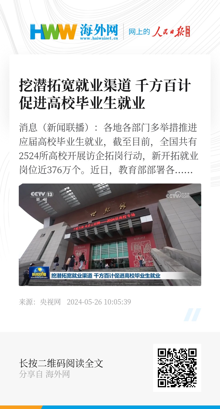 央视网消息(新闻联播):各地各部门多举措推进应届高校毕业生就业,截至目前,全国共有2524所高校开展访企拓岗行动,新开拓就业岗位近376万个。