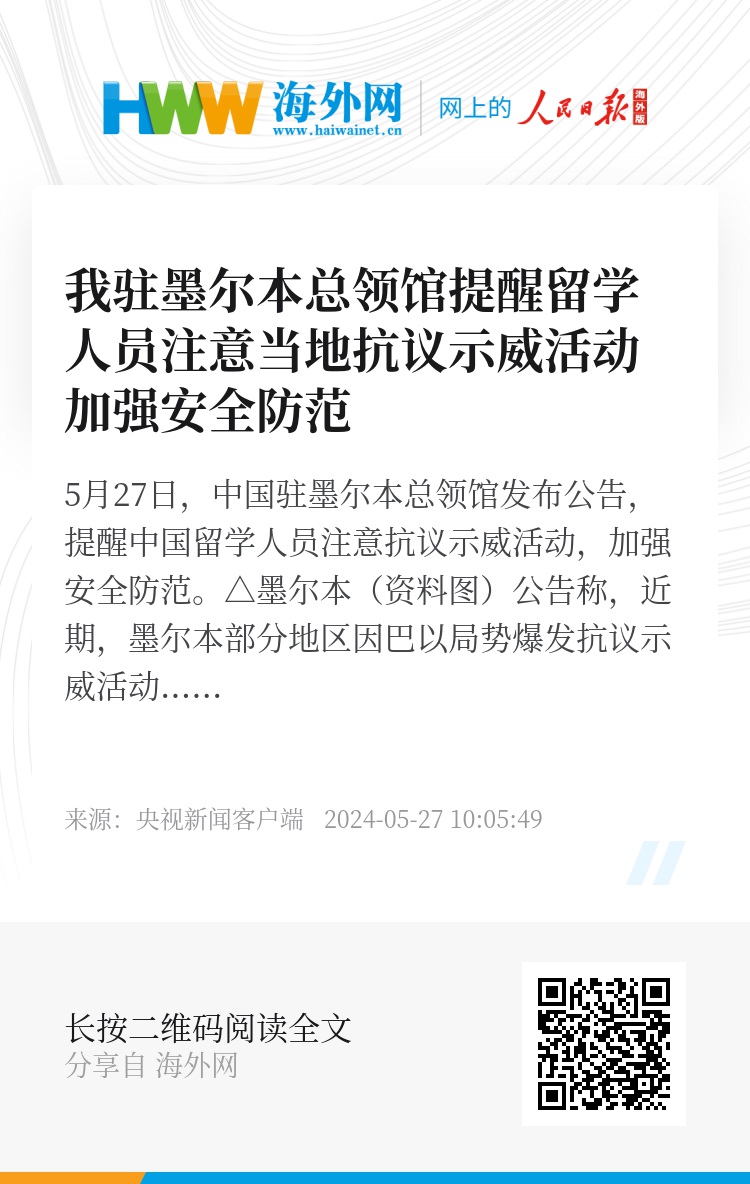 5月27日,中国驻墨尔本总领馆发布公告,提醒中国留学人员注意抗议示威活动,加强安全防范。