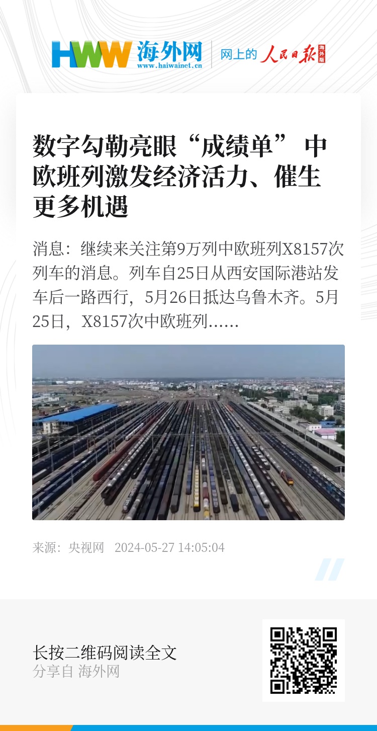 央视网消息:继续来关注第9万列中欧班列X8157次列车的消息。列车自25日从西安国际港站发车后一路西行,5月26日抵达乌鲁木齐。
