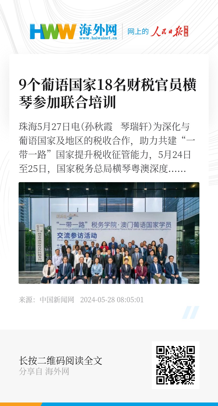 中新网珠海5月27日电(孙秋霞 琴瑞轩)为深化与葡语国家及地区的税收合作,助力共建“一带一路”国家提升税收征管能力,5月24日至25日,国家税务总局横琴粤澳深度合作区税务局与“一带一路”税务学院·澳门第三期跨境联合培训在横琴举办,来自葡萄牙、巴西、安哥拉等9个葡语国家的18名财税官员参加培训。