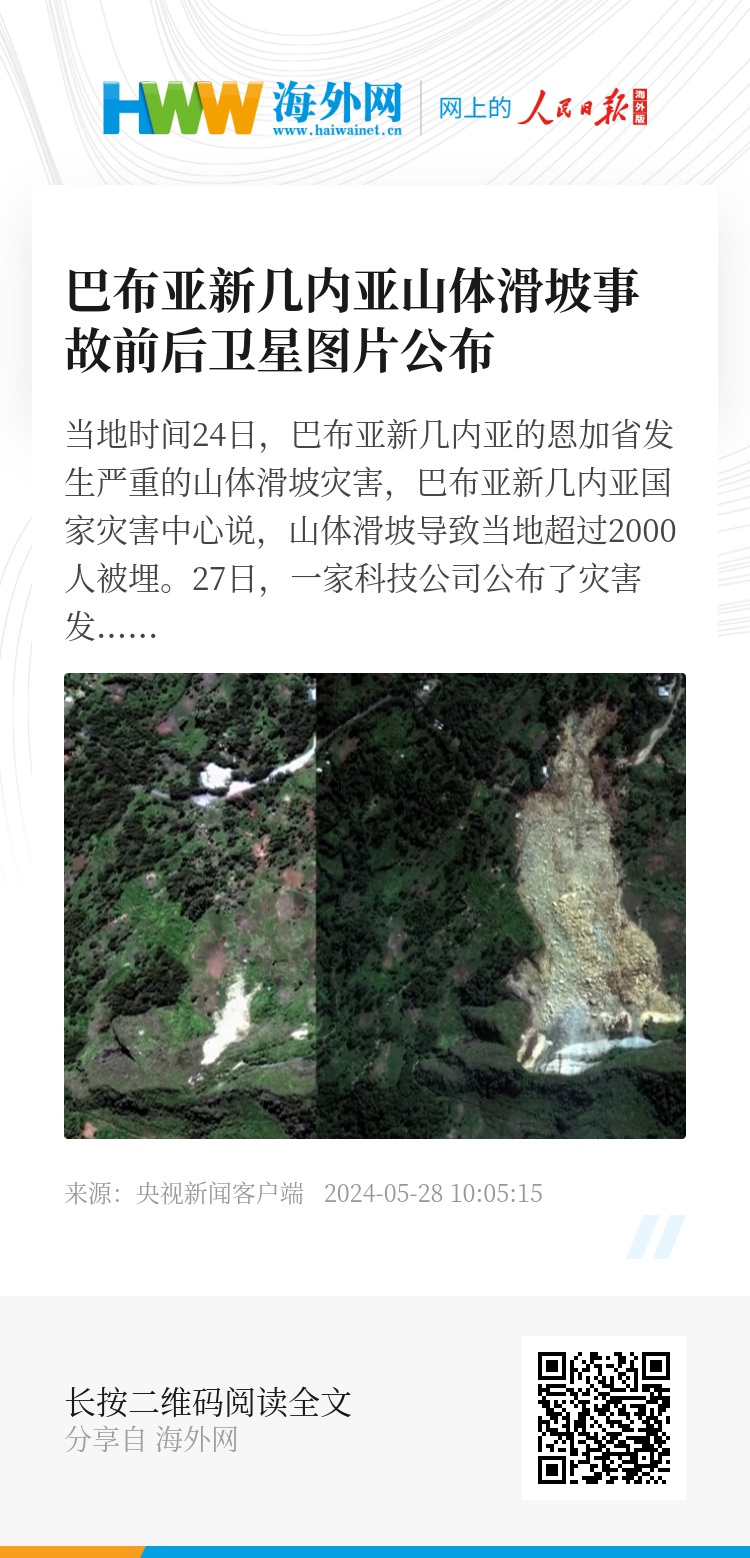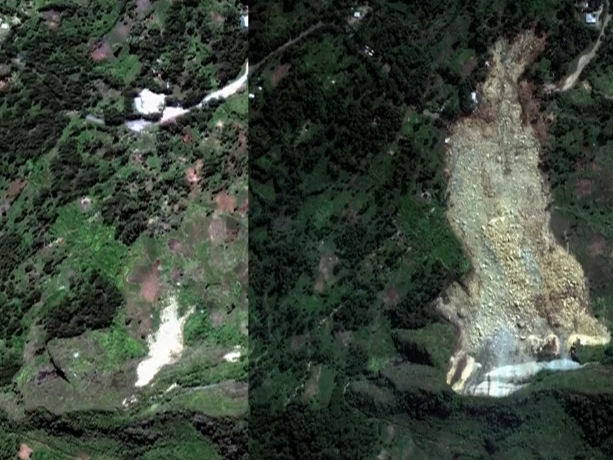 当地时间24日,巴布亚新几内亚的恩加省发生严重的山体滑坡灾害,巴布亚新几内亚国家灾害中心说,山体滑坡导致当地超过2000人被埋。27日,一家科技公司公布了灾害发生前后的卫星图片,通过对比,可以看出山体滑坡对当地造成的巨大破坏。