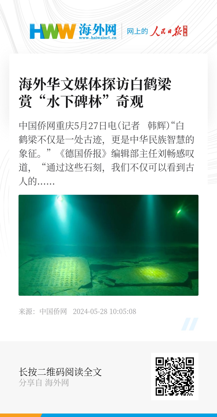 中国侨网重庆5月27日电(记者 韩辉)“白鹤梁不仅是一处古迹,更是中华民族智慧的象征。”《德国侨报》编辑部主任刘畅感叹道,“通过这些石刻,我们不仅可以看到古人的智慧与创造力,更能感受到他们对自然的观察和记录。”