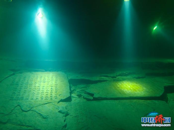 随后,海外华文媒体一行乘坐长91米的观光电梯缓缓下降至水下40余米的观测通道,通过厚重的玻璃窗,清晰地看到白鹤梁上的石刻和题记。