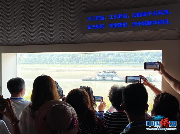 海外华文媒体代表在白鹤梁水下博物馆地面展厅凭窗遥望长江。记者韩辉 摄