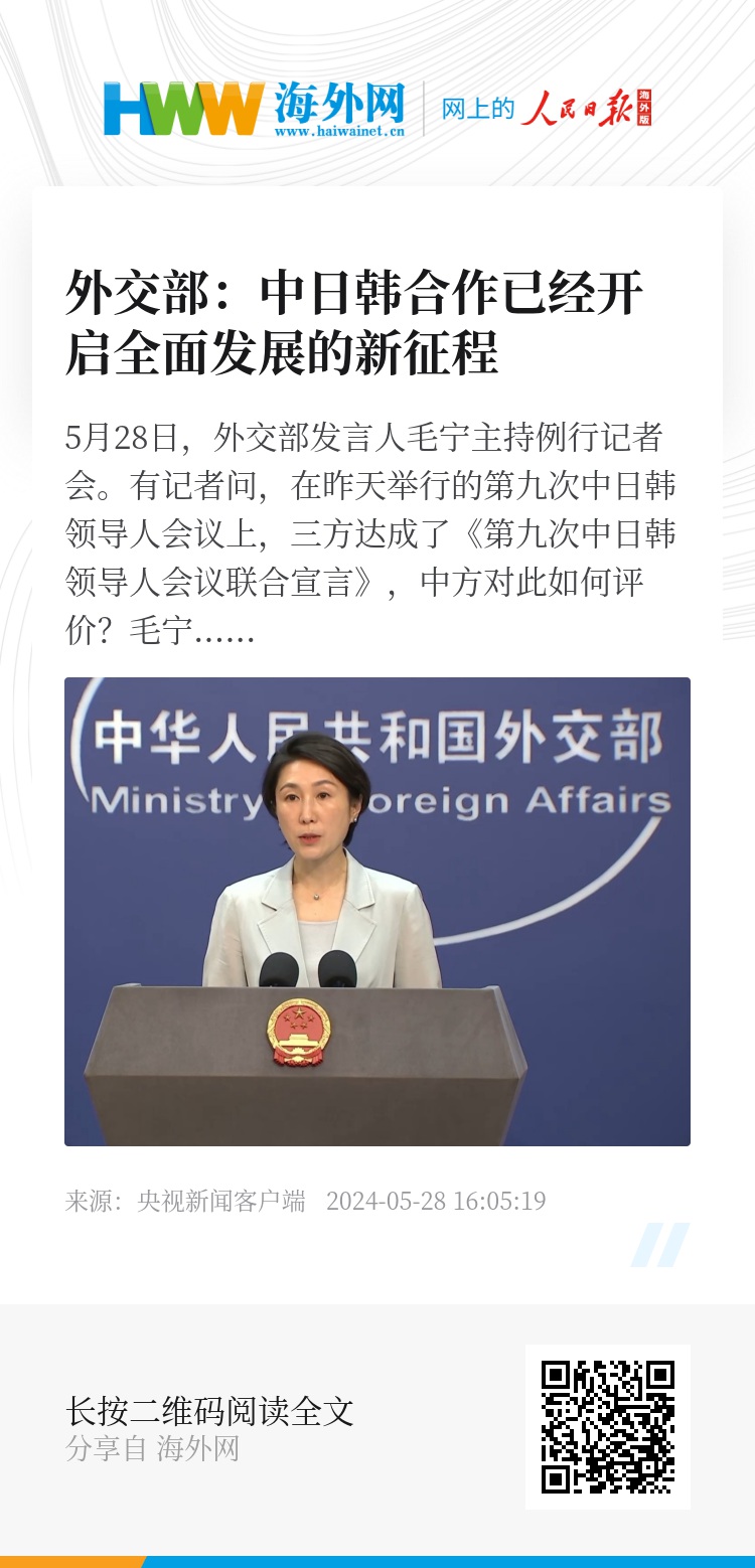 5月28日,外交部发言人毛宁主持例行记者会。有记者问,在昨天举行的第九次中日韩领导人会议上,三方达成了《第九次中日韩领导人会议联合宣言》,中方对此如何评价?