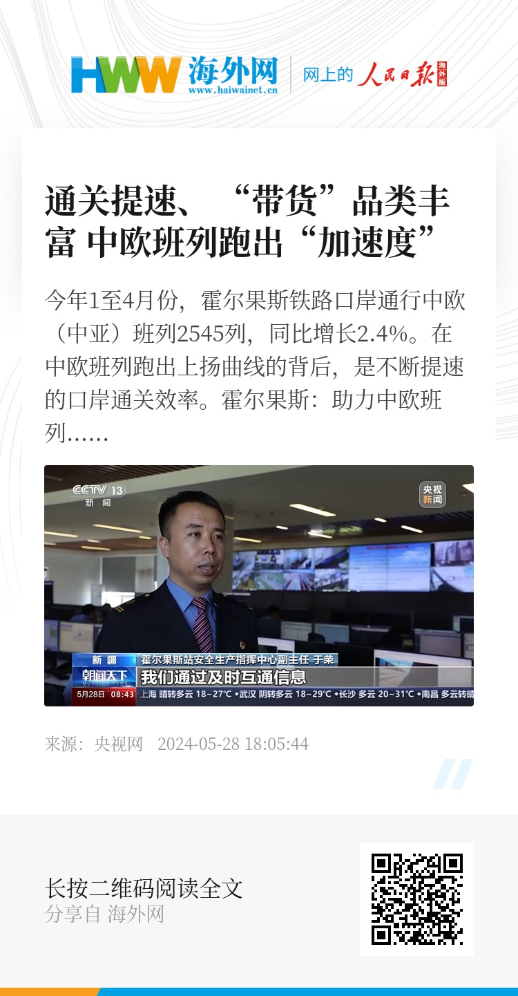 今年1至4月份,霍尔果斯铁路口岸通行中欧(中亚)班列2545列,同比增长2.4%。在中欧班列跑出上扬曲线的背后,是不断提速的口岸通关效率。