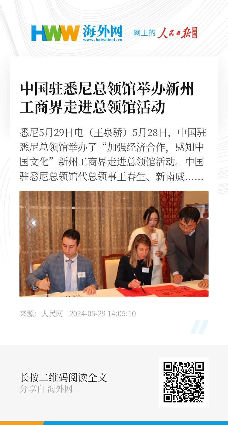 人民网悉尼5月29日电(王泉骄)5月28日,中国驻悉尼总领馆举办了“加强经济合作,感知中国文化”新州工商界走进总领馆活动。