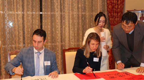 新州工商界代表进行书法体验(摄影 王泉骄)