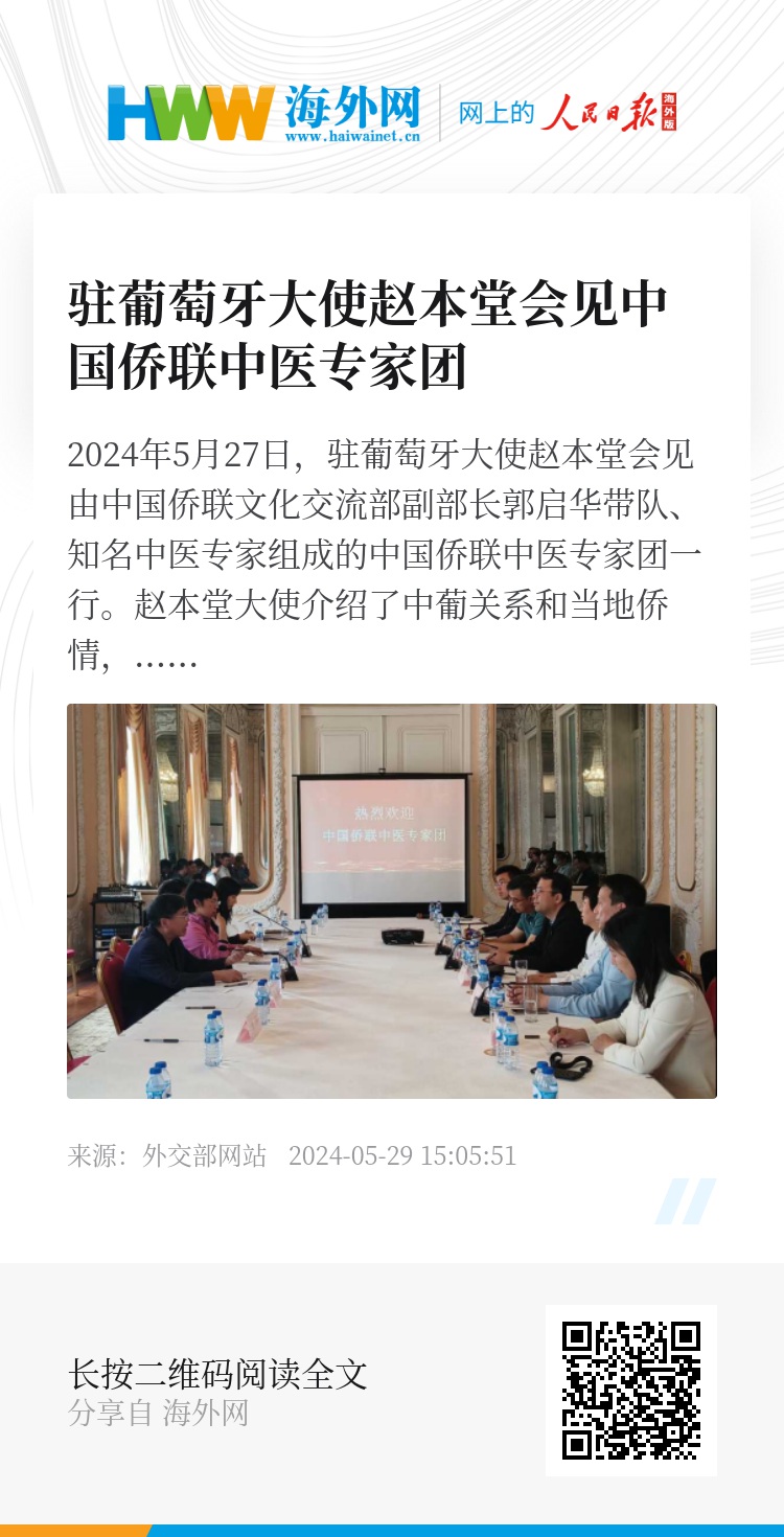 2024年5月27日,驻葡萄牙大使赵本堂会见由中国侨联文化交流部副部长郭启华带队、知名中医专家组成的中国侨联中医专家团一行。
