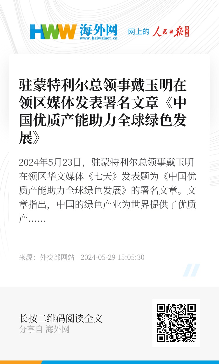 2024年5月23日,驻蒙特利尔总领事戴玉明在领区华文媒体《七天》发表题为《中国优质产能助力全球绿色发展》的署名文章。文章指出,中国的绿色产业为世界提供了优质产能、稀缺产能,不仅为全球绿色低碳转型作出重要贡献,还在当前世界经济形势下缓解了全球通胀压力,有力支撑了全球产业链供应链稳定。我们真正要反对是个别国家损害全球绿色发展的“保护主义过剩”。全文如下: