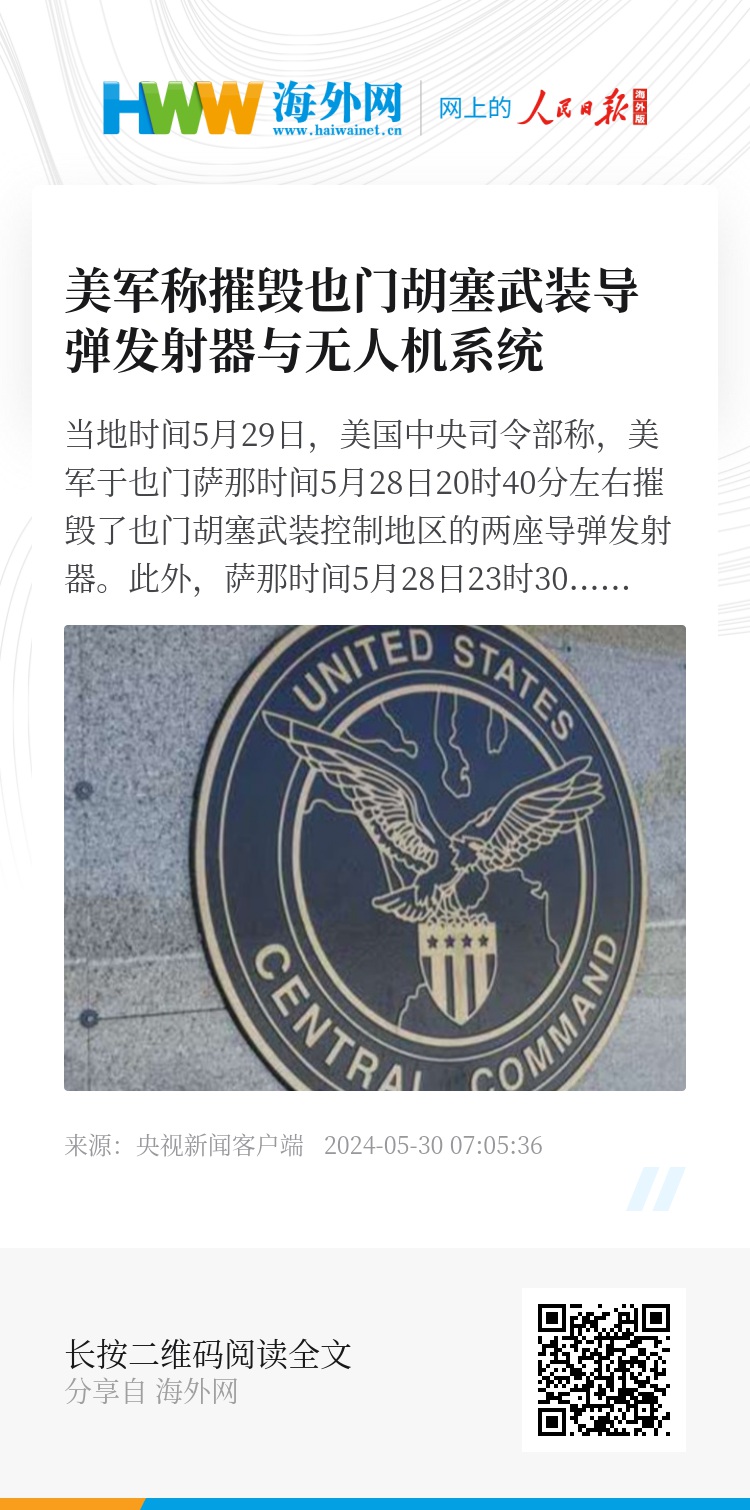 随后,萨那时间5月29日凌晨1时26分至1时38分,美国中央司令部部队摧毁了红海上空的两架也门胡塞武装控制区发射的无人机系统。(央视记者 徐德智)