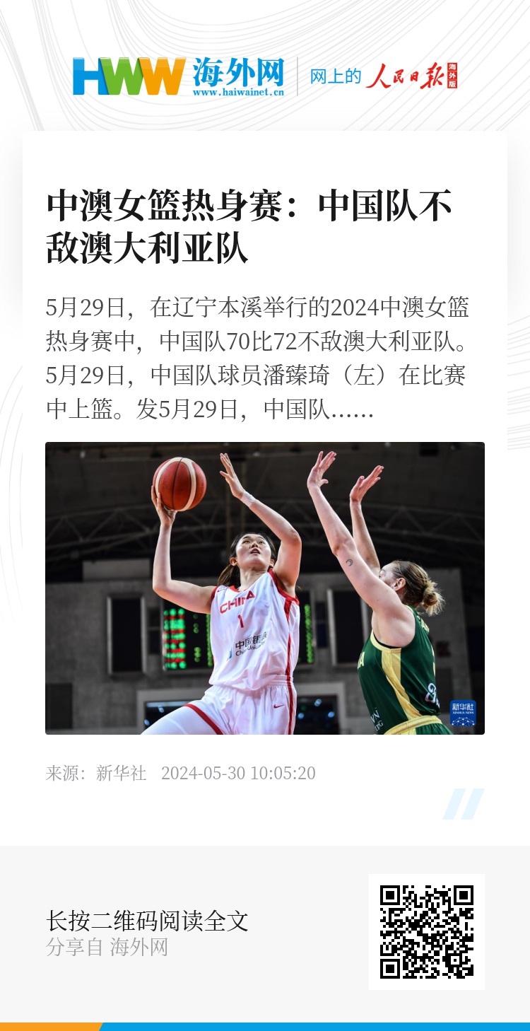 5月29日,在辽宁本溪举行的2024中澳女篮热身赛中,中国队70比72不敌澳大利亚队。