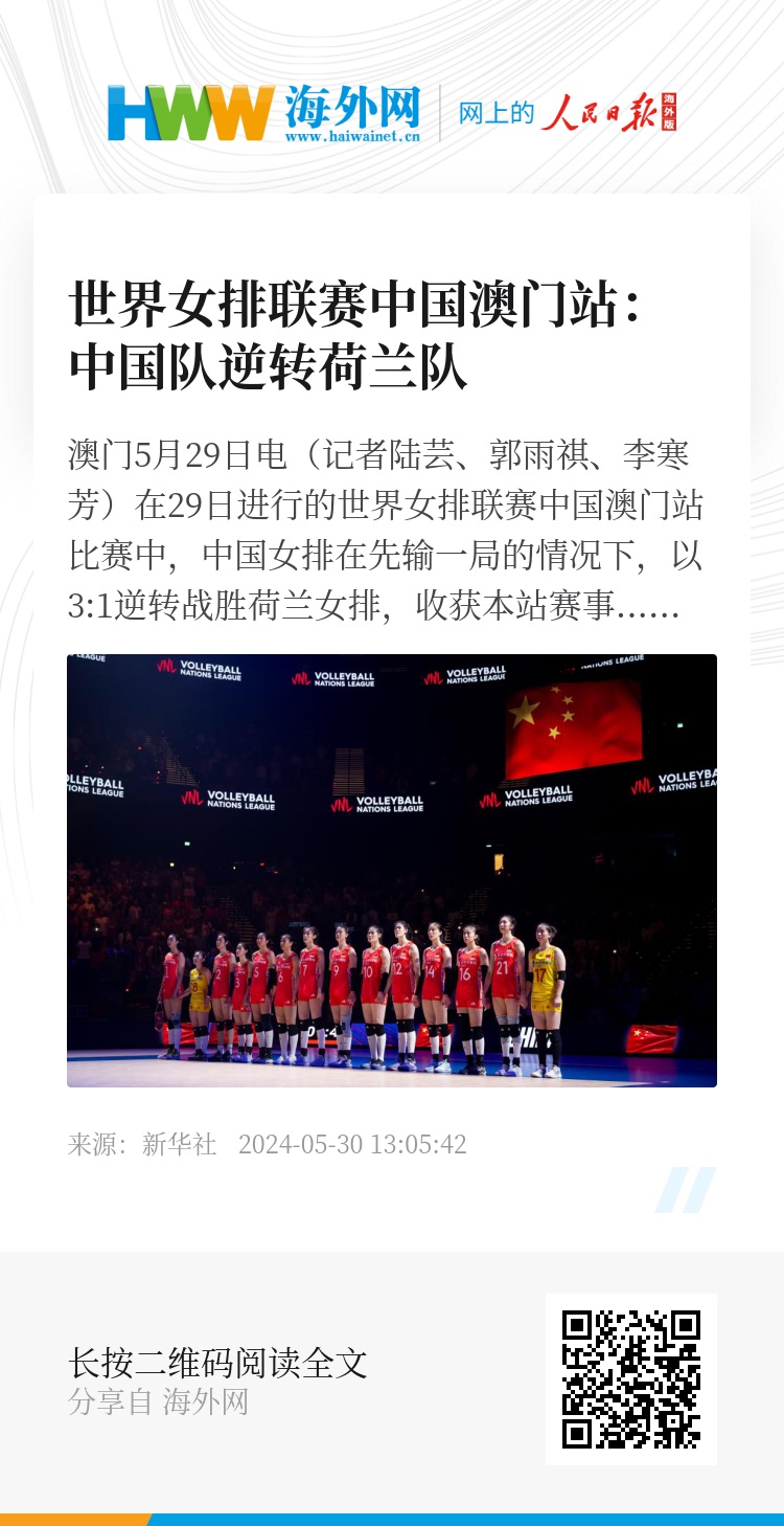 新华社澳门5月29日电(记者陆芸、郭雨祺、李寒芳)在29日进行的世界女排联赛中国澳门站比赛中,中国女排在先输一局的情况下,以3:1逆转战胜荷兰女排,收获本站赛事“开门红”。