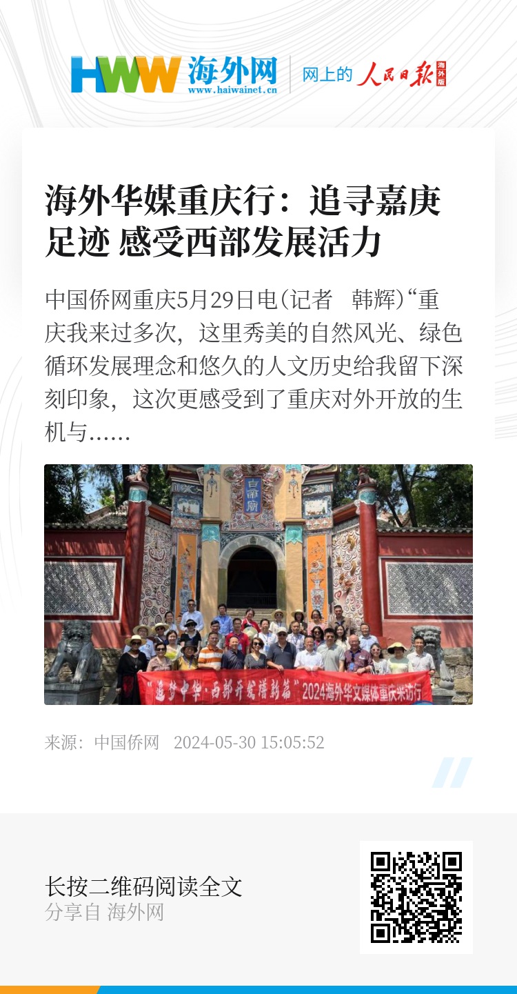 5月28日,“追梦中华·西部开发谱新篇”海外华文媒体重庆采访行在奉节县收官。在为期7天的行程中,来自德国、澳大利亚、墨西哥、柬埔寨等15个国家和地区的18家海外华文媒体代表先后走访渝北、渝中、涪陵、忠县等地。
