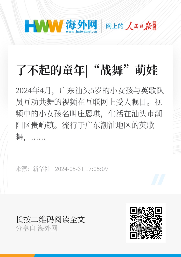 2024年4月,广东汕头5岁的小女孩与英歌队员互动共舞的视频在互联网上受人瞩目。视频中的小女孩名叫庄恩琪,生活在汕头市潮阳区贵屿镇。流行于广东潮汕地区的英歌舞,于2006年被列入第一批国家级非物质文化遗产代表性项目名录。在汕头市潮阳区贵屿镇,年轻人练英歌、跳英歌蔚然成风,不少小朋友也参与其中。