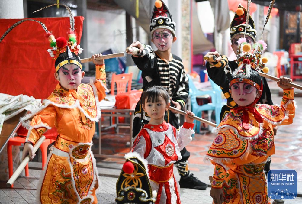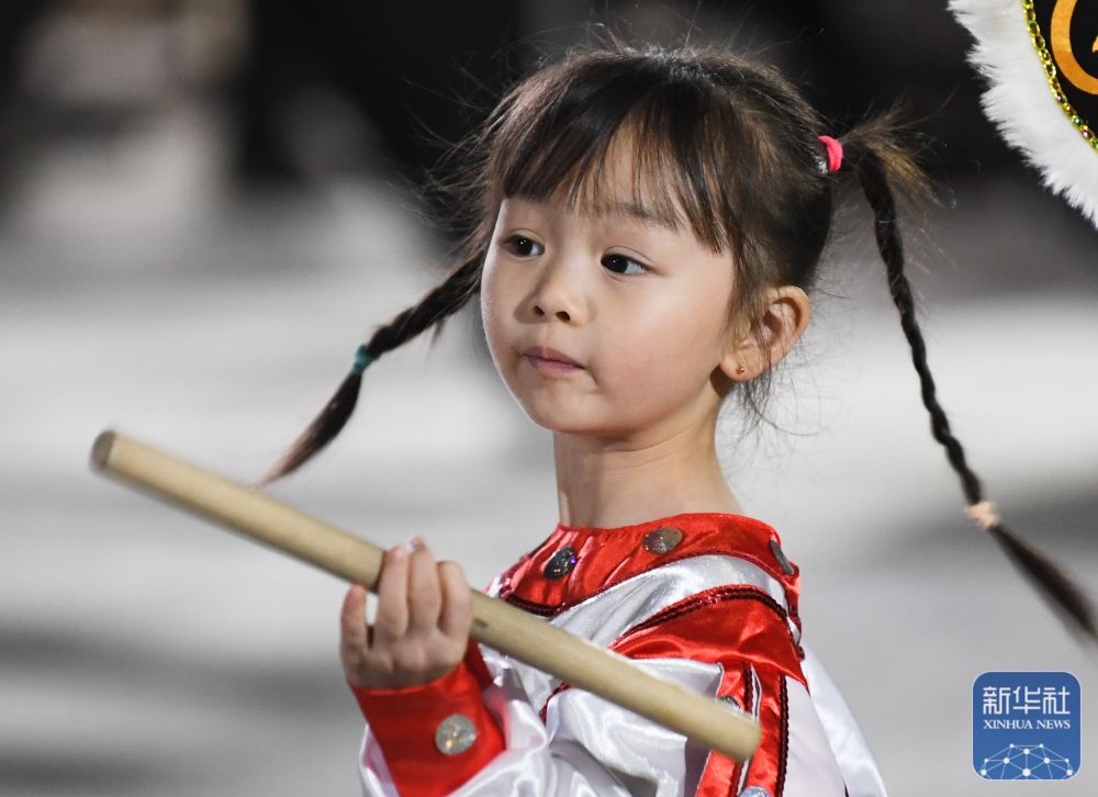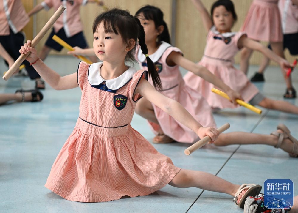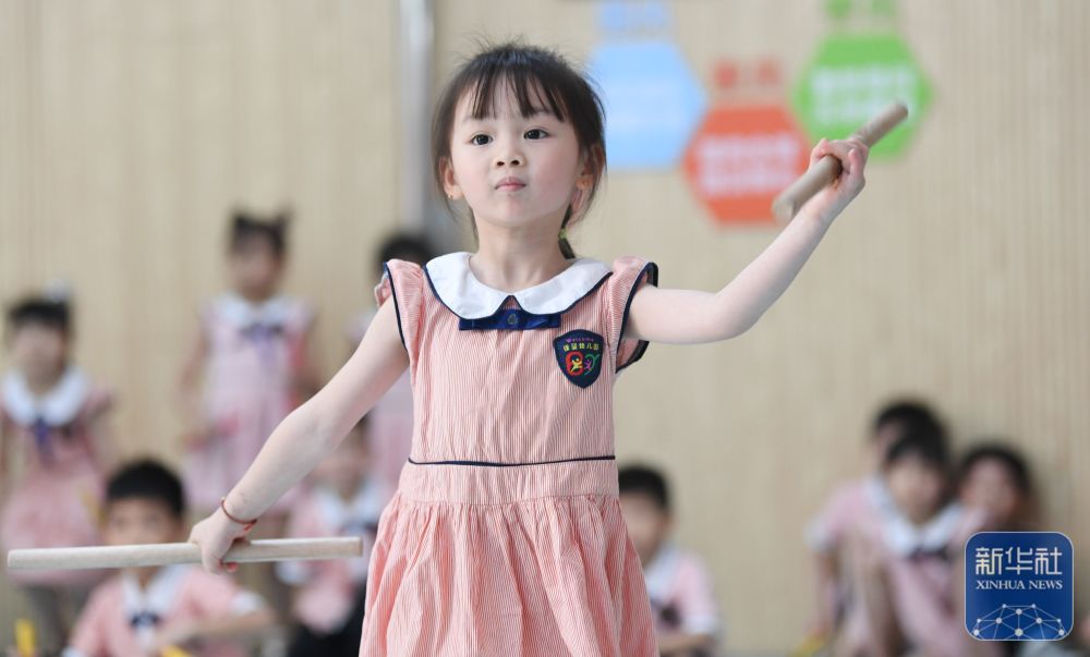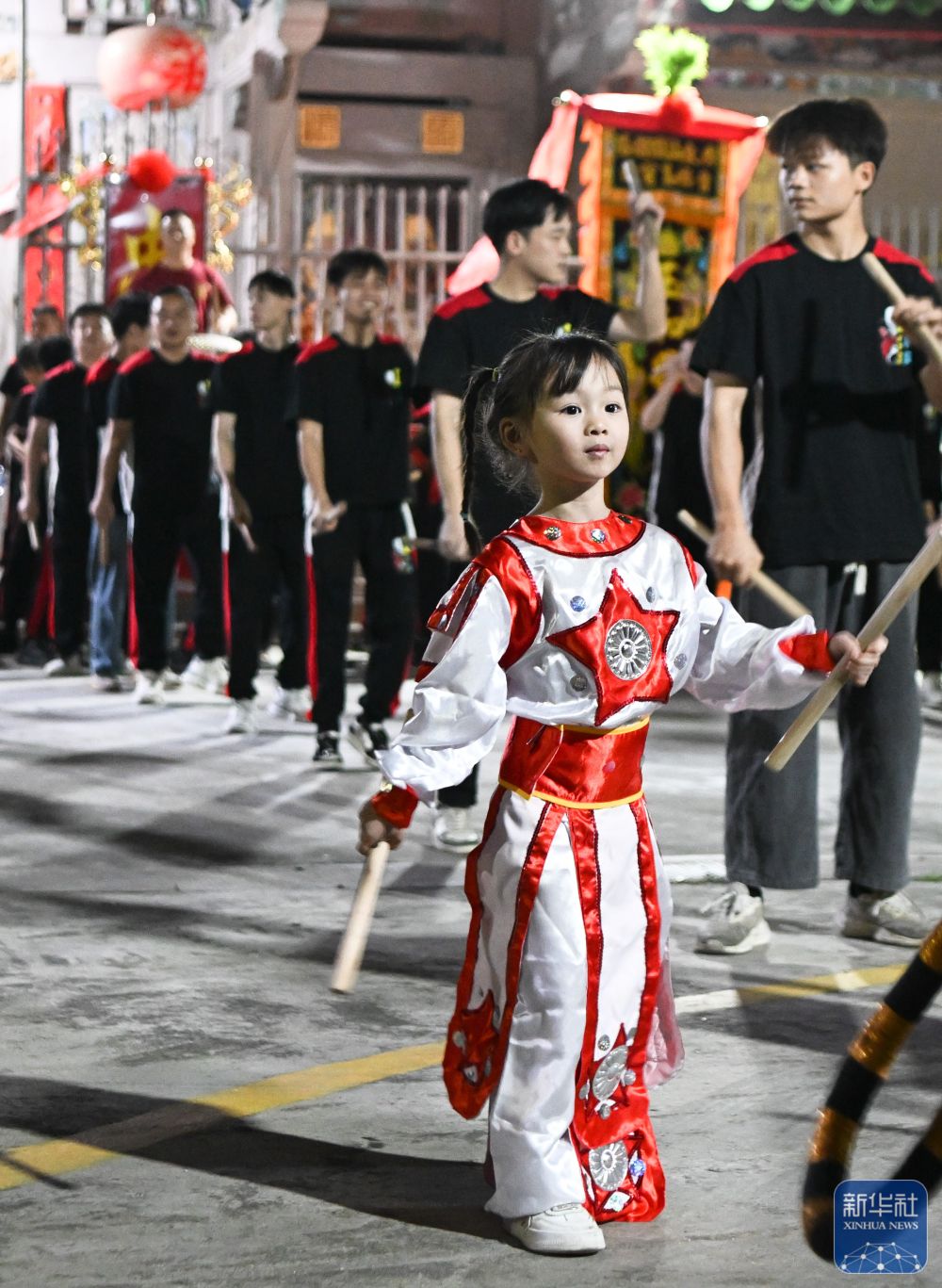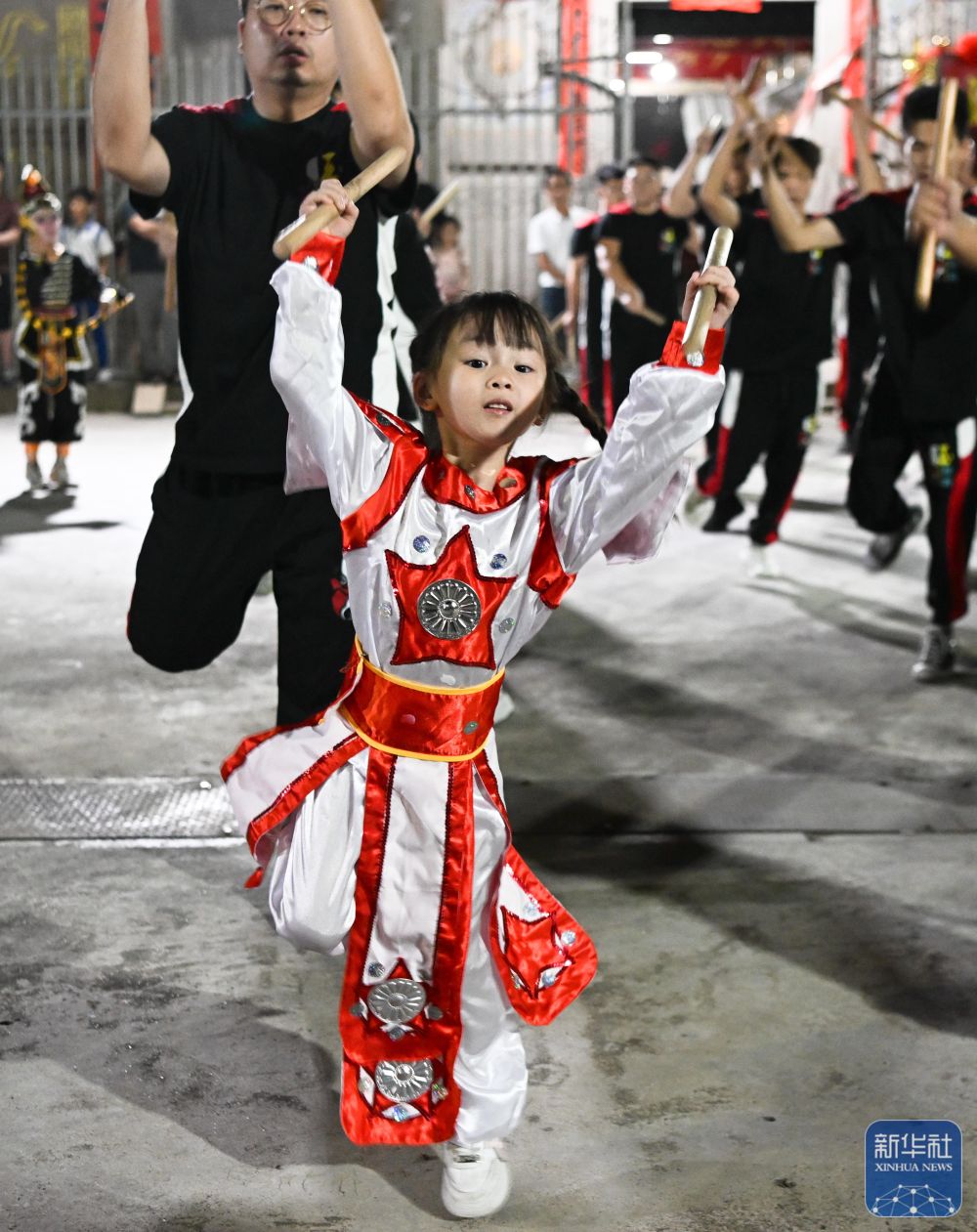 5月29日,在汕头市贵屿镇玉窖村的英歌队排练现场,庄恩琪(前中)与玉和兴英歌队队员一起跳英歌舞。 庄恩琪就读于贵屿镇北林保婴幼儿园,幼儿园时常组织小朋友们学跳英歌舞锻炼身体,从英歌舞中体验勇往直前的拼搏精神。 随着当地组织英歌进校园、进社区的力度不断加大,越来越多的孩子加入到非遗传承的队伍中来,为古老的“战舞”注入生生不息的活力。