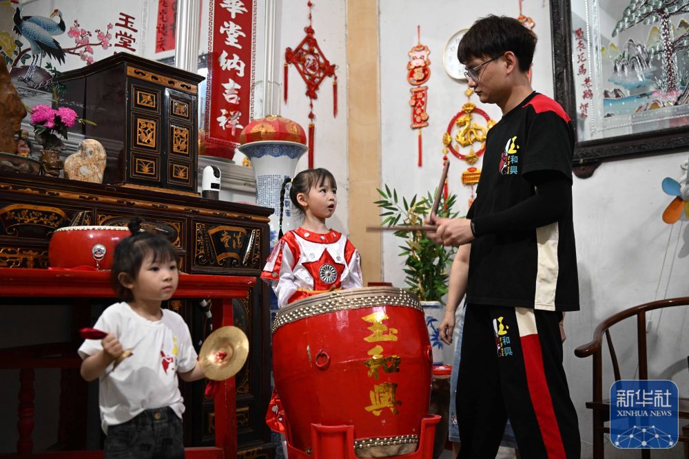 5月29日,在汕头市贵屿镇玉窖村的家中,父亲庄镕强(右)指导庄恩琪(中)和妹妹庄雅琪练习“敲锣打鼓”。