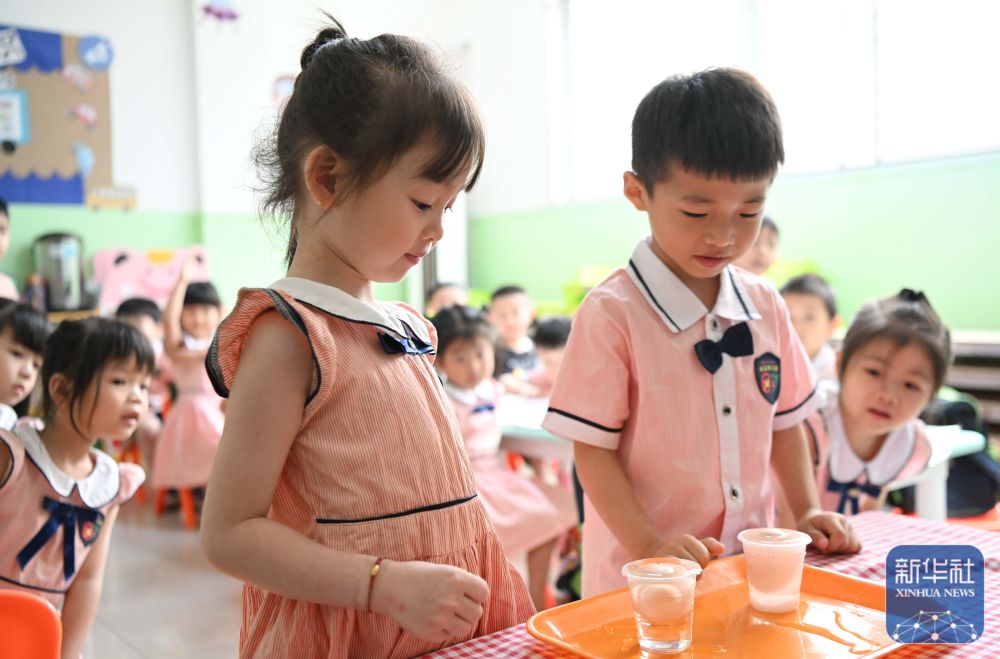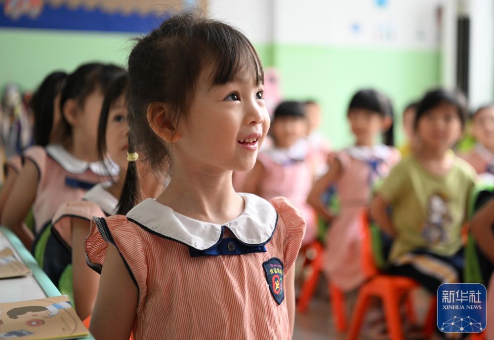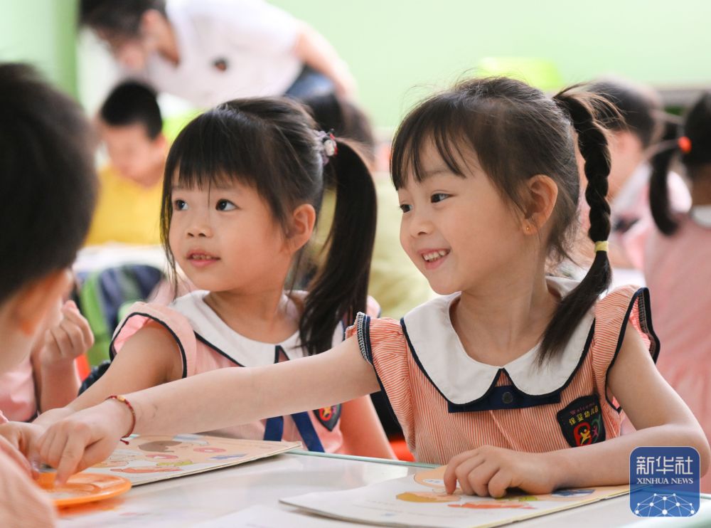 5月29日,在汕头市贵屿镇北林保婴幼儿园,庄恩琪(右)和同学在课堂上。