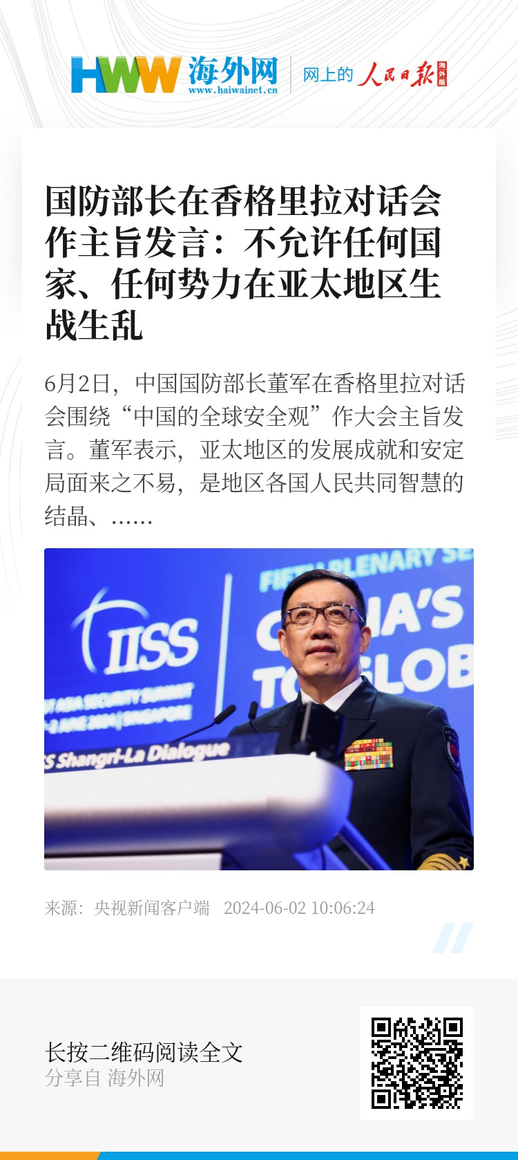 6月2日,中国国防部长董军在香格里拉对话会围绕“中国的全球安全观”作大会主旨发言。