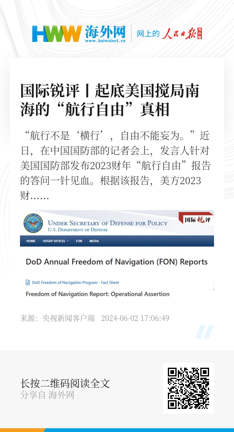 “航行不是‘横行’,自由不能妄为。”近日,在中国国防部的记者会上,发言人针对美国国防部发布2023财年“航行自由”报告的答问一针见血。根据该报告,美方2023财年共挑战包括中国在内的17个国家或地区的29项“过度海洋主张”。